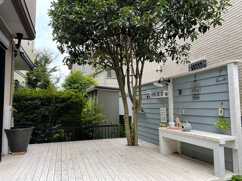 庭に生えていた自然木を生かした白いウッドデッキです。